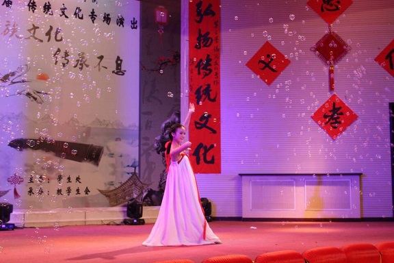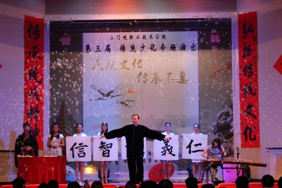 活动在热情洋溢的开场舞藏族舞《吉祥锅庄》中拉开了帷幕。宫廷舞《庆隆舞》舞姿曼妙,婀娜多姿;古典舞《相和歌》刚劲有力,自然洒脱;手语操《跪羊图》感念母恩,孝感动天;舞蹈《采薇》衣袂飘飘,美轮美奂;诗朗诵《春江花月夜》声情并茂,抑扬顿挫;歌曲《粉墨人生》别具特色,扣人心弦。汉服展示、旗袍展示、古典歌曲等中华传统文化的展演,将演出一次次推向高潮,使在场师生重温传统经典,感受中华文化的博大魅力。最后,演出在刚柔并济的太极、笔精墨妙的书法、雅俗共赏的古筝三位一体的《中国风·华夏韵》中落下了帷幕。