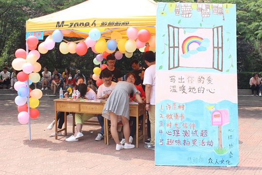 5月23日中午,由学生处、公共教学部主办,校学生会、校心理协会承办的第三届“5·25”大学生心理健康节在文化广场举行。学生处处长黄世谋,心理健康教育中心副主任郅利聪,学生处、心理健康教育中心老师出席了本次活动。