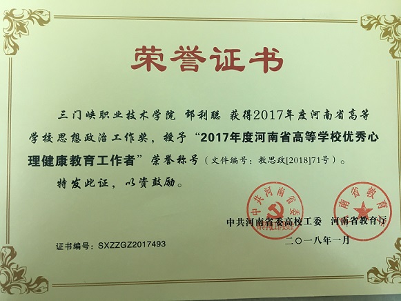 近日,中共河南省委高校工委、河南省教育厅下发《关于公布2017年度河南省高等学校思想政治工作奖评审结果的通知》(教思政〔2018〕71号),球王会平台心理健康教育中心副主任郅利聪获得2017年度河南省高等学校思想政治工作奖,授予“2017年度河南省高等学校优秀心理健康教育工作者”荣誉称号。