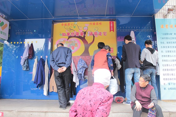 服务部学生干部带头捐赠,他们收集了许多闲置的干净衣物挂在爱心墙上,有棉衣、外套、衬衫等等,为需要的人们送去一份温暖,献出一份爱心。路过的一些老人了解情况后,纷纷挑选自己需要的衣物,脸上露出开心幸福的笑容。(供稿人:校学生会王静宜)